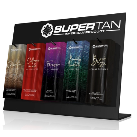 Ekspozytor SuperTan - kolor czarny z 5 czarnymi haczykami; wykonany z czarnej plexi